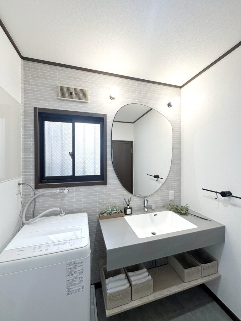 洗面台は、シンプルでおしゃれなカウンター式洗面台として人気のある、AICAの「スマートサニタリーU」を採用。種類が豊富な中から選べるため、洗面所の広さや使い方に合わせた洗面台リフォームが可能です。ミニマルですっきりとしたデザインで、使いやすさと美しさを両立した水まわり空間に仕上がりました。