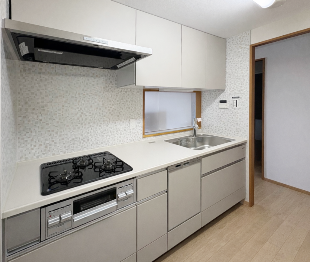 築26年が経過したマンションで、「水まわりを一新して、これからも快適に暮らしたい」との思いからフルリフォームをご依頼いただきました。歪な間取りによるデッドスペースの活かしづらさや、暗く使いにくいキッチンまわり、カビが気になる箇所もあり、「将来を見据えて住みやすく手入れしやすい住まいにしたい」「スケルトンリノベーションで一新したい」というご要望も。そこで間取りから見直し、壁付けキッチンはオープンな回遊式へ配置換えしました。