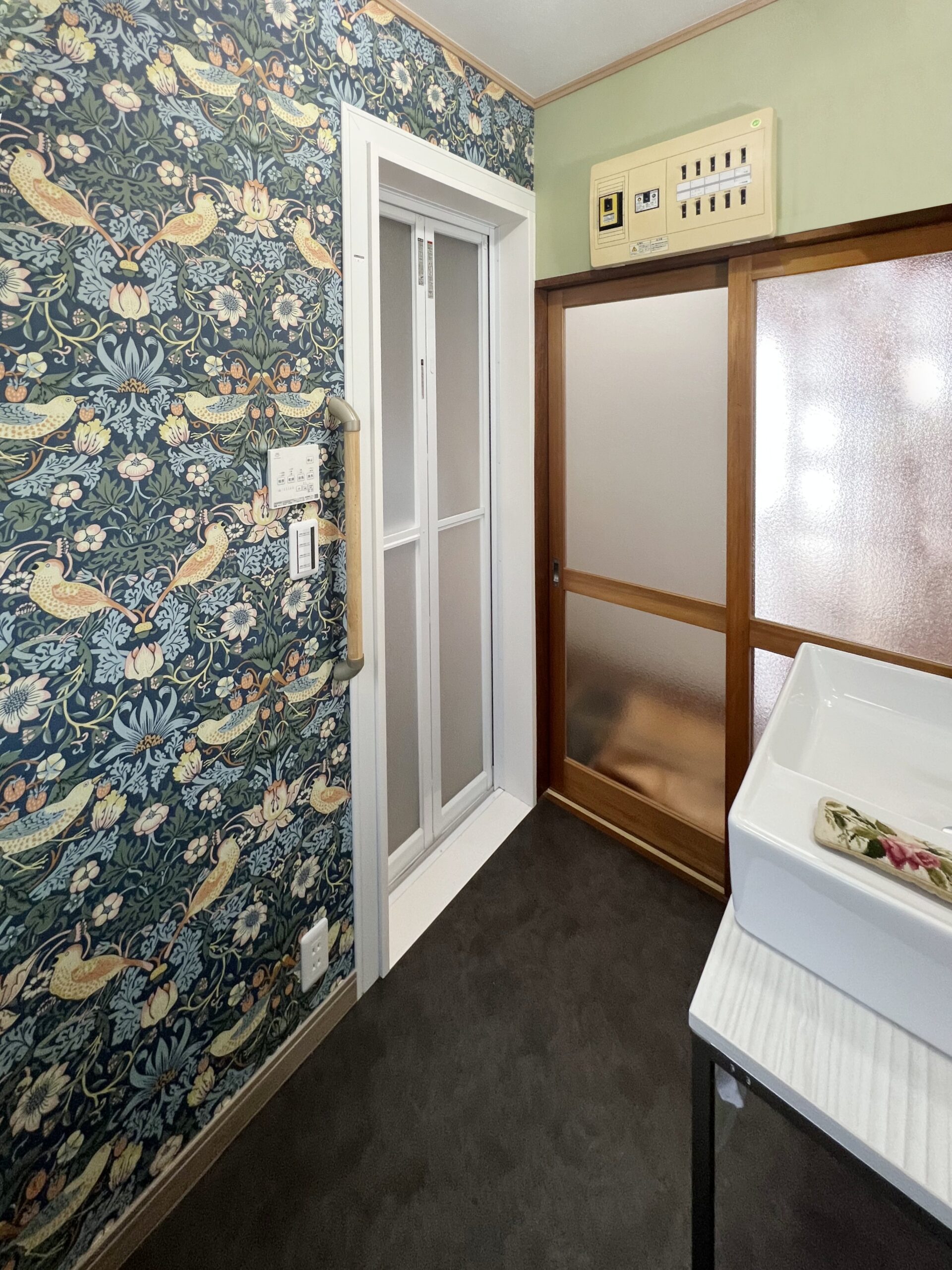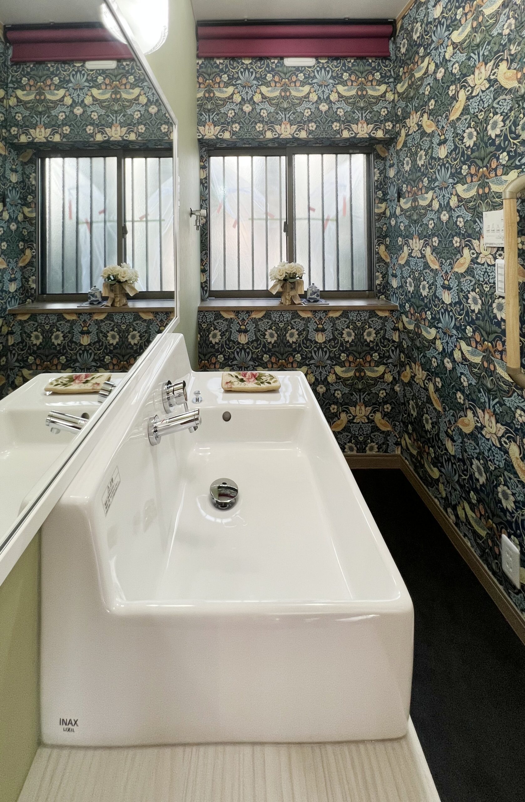 クロス(壁紙)には、存在感のある植物柄のデザインを採用しました。 草花のモチーフがはっきりと描かれたデザインは、洗面室のアクセントとして空間全体を引き締め、おしゃれで印象的な雰囲気を演出します。 日々の身支度や家事の合間にも、気持ちが軽やかになるような空間になりました。
