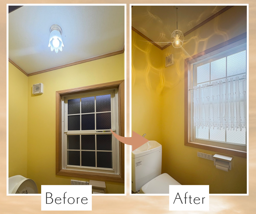 今回お客様が選ばれたイエロー系のクロスとの相性がよく、照明の光が壁に柔らかく反射することで、トイレ空間がまるでギャラリーのような雰囲気に。