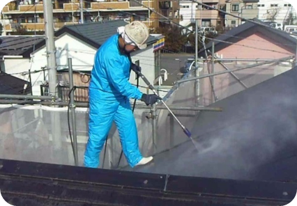 屋根や外壁の汚れやコケを落とし、塗料がしっかり密着するようにします。
