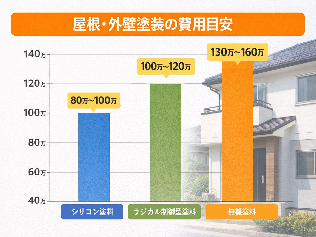 外壁塗装の費用は住宅の大きさや塗料によって異なりますが、一般的な戸建て住宅では80万円〜150万円前後が目安になります。