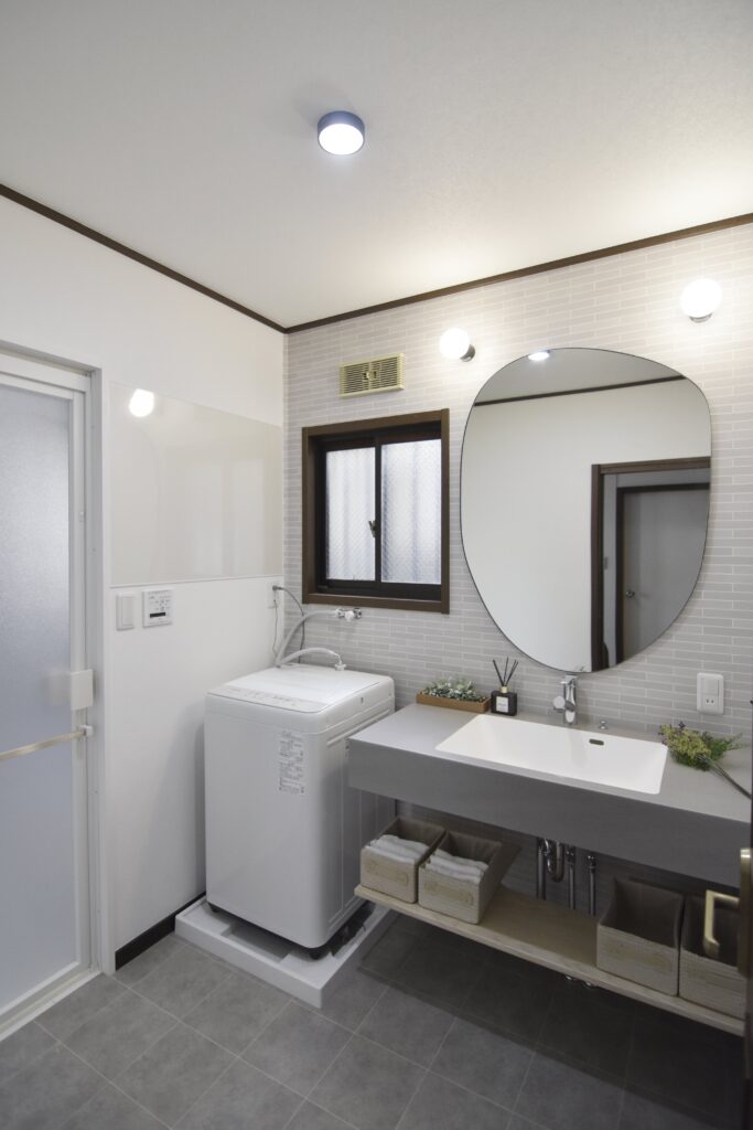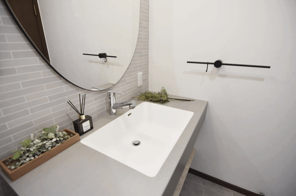 洗面台は、シンプルでおしゃれなカウンター式洗面台として人気のある、AICAの「スマートサニタリーU」を採用。種類が豊富な中から選べるため、洗面所の広さや使い方に合わせた洗面台リフォームが可能です。ミニマルですっきりとしたデザインで、使いやすさと美しさを両立した水まわり空間に仕上がりました。