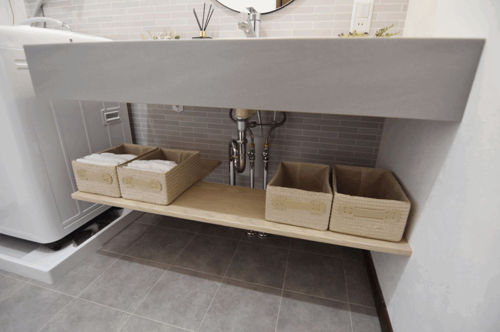 カウンター式洗面台の収納部は扉を設けず、ボックスでアレンジできる見せる収納に。