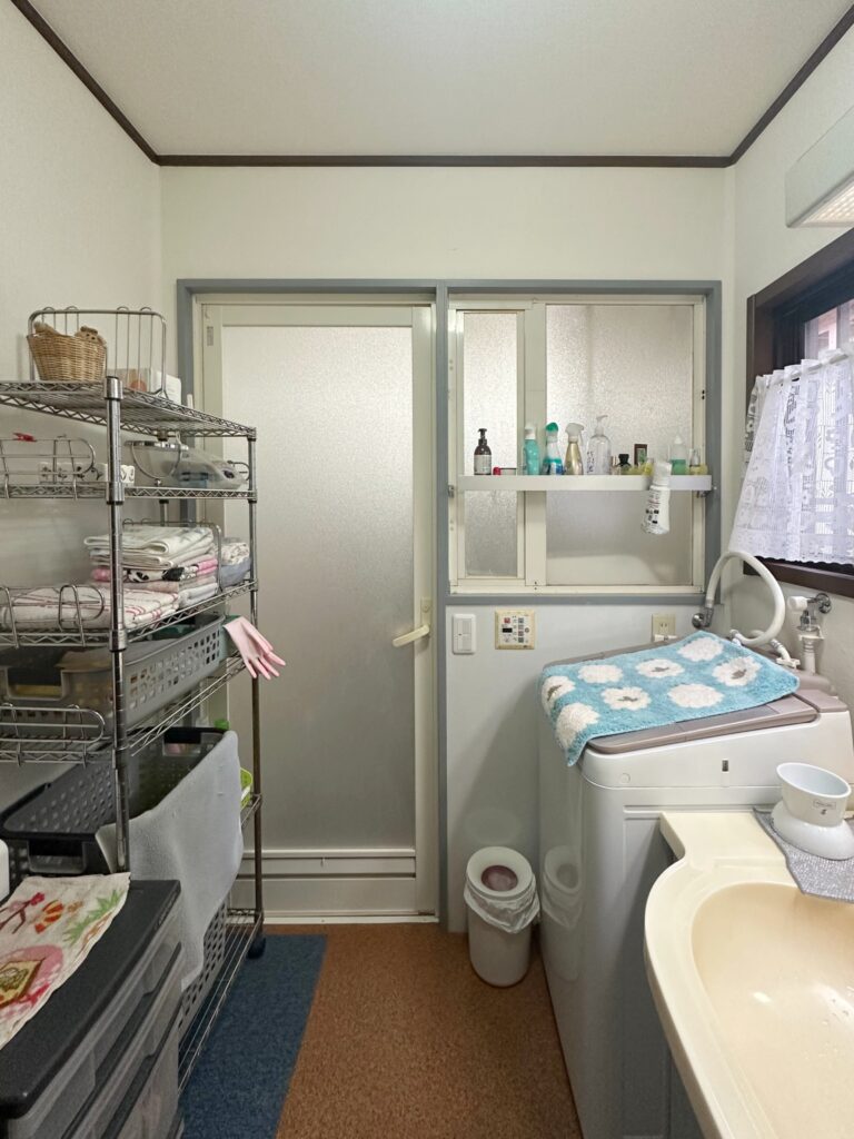 浴室側の小窓と収納棚に、洗剤類が無造作に置かれていた工事前の状態。