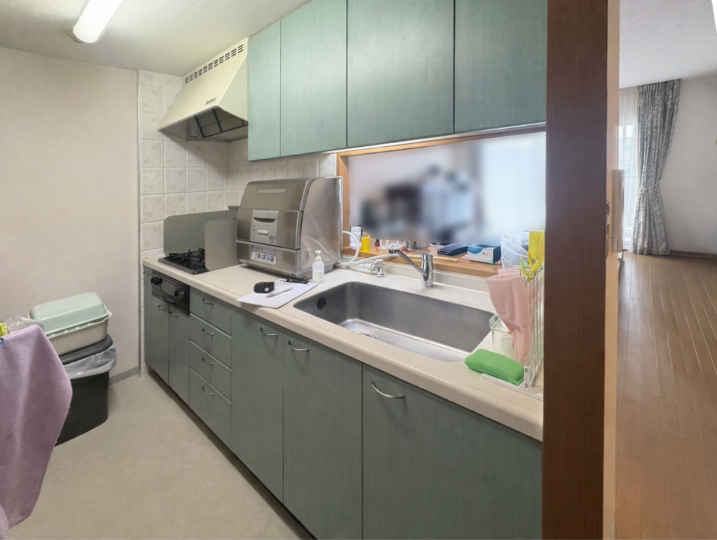卓上食洗機をビルトインタイプに変更して調理スペースを広く確保し、収納も開き戸から引き出しにすることで使いやすさと収納力を高めました。
