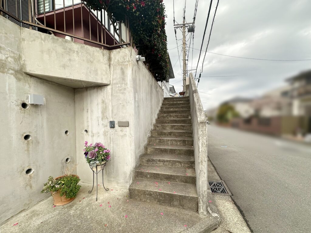 玄関ポーチ同様にシンプルなコンクリート階段でしたが、やや味気なく、汚れが気になる状態でした。